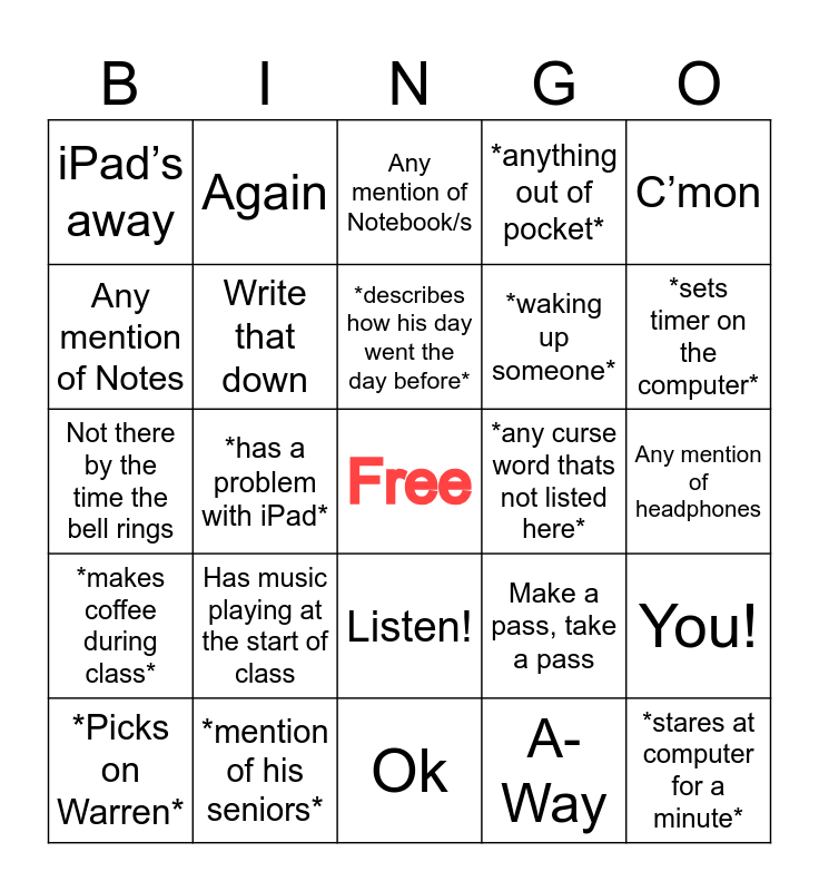This bingo card has a free space and 28 words: You!, "talk at your tables", *waking up someone*, A-Way, Any mention of Notes, Any mention of Notebook/s, Again, *makes coffee during class*, *any curse word thats not listed here*, *Picks on Warren*, Not there by the time the bell rings, *anything out of pocket*, *mention of his seniors*, Ok, *sets timer on the computer*, Shut up!, Has music playing at the start of class, Write that down, *describes how his day went the day before*, Listen!, iPad’s away, Anything Detention related, *stares at computer for a minute*, *has a problem with iPad*, Any mention of headphones, Make a pass, take a pass, C’mon and *arms crossed in the middle of the room*.