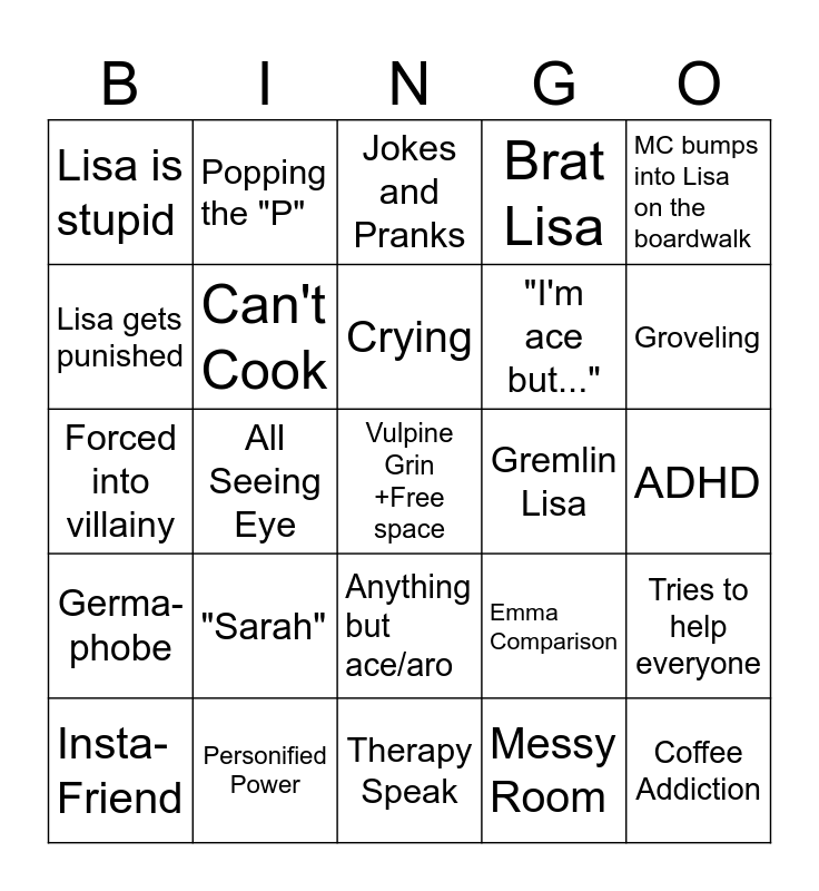This bingo card has a free space and 24 words: "Sarah", Personified Power, Crying, Insta-Friend, MC bumps into Lisa on the boardwalk, Lisa is stupid, Lisa gets punished, Popping the "P", Gremlin Lisa, Anything but ace/aro, "I'm ace but...", Forced into villainy, Emma Comparison, Tries to help everyone, Can't Cook, Messy Room, ADHD, Jokes and Pranks, Groveling, All Seeing Eye, Coffee Addiction, Germa-phobe, Brat Lisa and Therapy Speak.