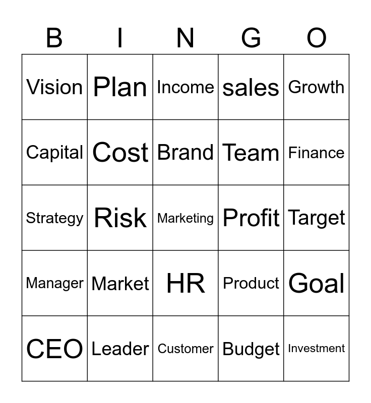 This bingo card has 25 words: Market, Customer, Brand, CEO, Growth, Vision, Capital, Plan, Profit, HR, Team, Strategy, Product, Goal, Cost, Investment, Target, Income, Finance, Risk, Marketing, Leader, Manager, sales and Budget.