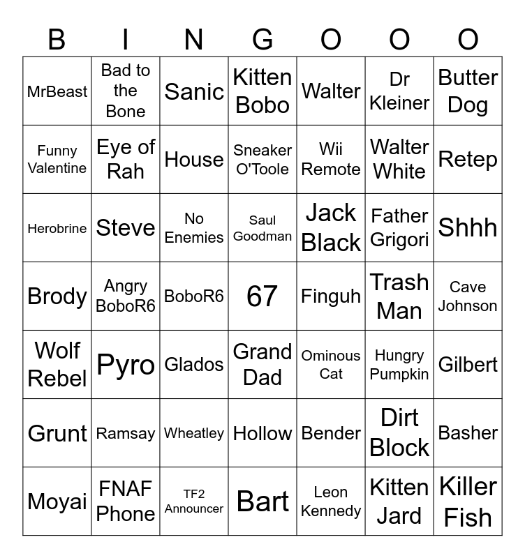 This bingo card has 205 words: 1000 Yard Stare, 61, 67, Adrian Shepard, Alyx Vance, Annoying Orange, Anthony Mackie, Anuc, Appearing Skeleton, Bad to the Bone, Baller, Barbacue Bacon Burger, Bart, Bartolozzi, Basher, Beetlejuice, Bender, Bell, Biggest Loser, Bite Of 87, Blue, Blue Lobster, Blue Smurf Cat, Bobo, Brody, Butter Dog, Calc, Caseoh, Cave Johnson, Chill Guy, Civic, Cloaker, Combine, Conquest, Costco Guys, Cr1TiKaL, Crazy, Cuteness Overload, Darth Vader, Dart Monke, Demoman, Dio, Dirt Block, DJ Khaled, Do The Roar, Doug Dimmadome, Dr Kleiner, Dr Livesey, El Gato, Elite, Engineer, Eye of Rah, Father Grigori, Finguh, Finn the Human, FNAF Phone, Freddy Fazbear, Funny Valentine, Gaben, Gi hun, Gilbert, Glados, Glen, GMan, Gojo, Grand Dad, Grug, Grunt, HappyWheels, Heavy, Herobrine, Hitman, Hollow, Home Alone, Homelander, Homer Uchicha, House, Hungry Pumpkin, Hutcherson, Idiot, IdkSterling, Infomaniac, Jack Black, Jake the Dog, Jamiroquai, JC, Job Application, John Cena, Jonkler, Jotaro, Killer Fish, King, Knee Surgery, Krispy Kreme, KSI, Kwebbelkop, Leon Kennedy, Luffy, Lunchly, Mariah Carey, Master Chief, MatPat, Medic, Meem, Metal Pipe, Minion, Morty Smith, Moyai, MrBeast, Mr Krabs, Mythical Tree, Napoleon, Nathaniel B, Ned Stark, Nerd, NickEh30, Ninja, No Enemies, Normal Difficulty, Omar, Ominous Cat, Omni Man, Patrick, Paul Atreides, Peter Griffin, Pharaoh, Pickle Rick, Popcat, Property Owner, Prospector, Prunsel, Pufferfish, Puzzle Solver, Pyro, Ramsay, Real Life, Retep, Rick Friend, Rick Sanchez, Sad Sponge, Sal Vulcano, Sanic, Sans, Saul Goodman, Scientist, Scout, Screaming Stark, Seal, Senator Armstrong, Shadow the Hedgehog, Shhh, Sisyphus, Skinwalker, Smart Man With Glasses, Sneaker O'Toole, Sniper, Soldier, Spongebob, Spy, Stark, Steve, Strawberry Elephant, Talking Ben, Target Invincible, TF2 Announcer, Thanos, The Lich, Todd Howard, Touchdown Western, Tralalero, Trash Man, Troll, Tuco, Vegas Burger, Vsauce, Wake Up, Walter, Walter White, Wega, Wenomechainsama, Wheatley, Wheatley Crab, Wii Remote, Yuji, Zoidberg, huh, u, xqc, Angler, Angry BoboR6, Angry Munci, BoboR6, Cat Jard, Gubby, Hard Difficulty, JardR6, Kitten Bobo, Kitten Jard, Mimic, Pandemonium, Rebel, Slasher, Super Munci, Wolf Rebel and steam happi.