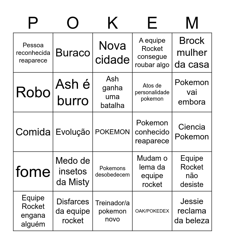 This bingo card has a free space and 35 words: Novo Pokemon, Brock paquera uma mulher, Misty passa-se dos cornos, Ash é burro, Pokemons desobedecem, A equipe Rocket consegue roubar algo, Robo, Equipa do ash captura pokemon, Ash ganha uma batalha, Pokebola diferente, Comida, Brock mulher da casa, Dormir Fora, Ash e amigos são perseguidos, Pessoa reconhecida reaparece, Pokemon conhecido reaparece, OAK/POKEDEX, Evolução, fome, Jessie reclama da beleza, Mudam o lema da equipe rocket, Equipe Rocket engana alguém, Equipe Rocket não desiste, Disfarces da equipe rocket, Nova cidade, Pokemon vai embora, Problema do Episodio, Referencias ao jogo, Atos de personalidade pokemon, Ciencia Pokemon, Ash age incrivelmente de uma forma inteligente, Treinador/a pokemon novo, Medo de insetos da Misty, Buraco and Brock enlouquece.