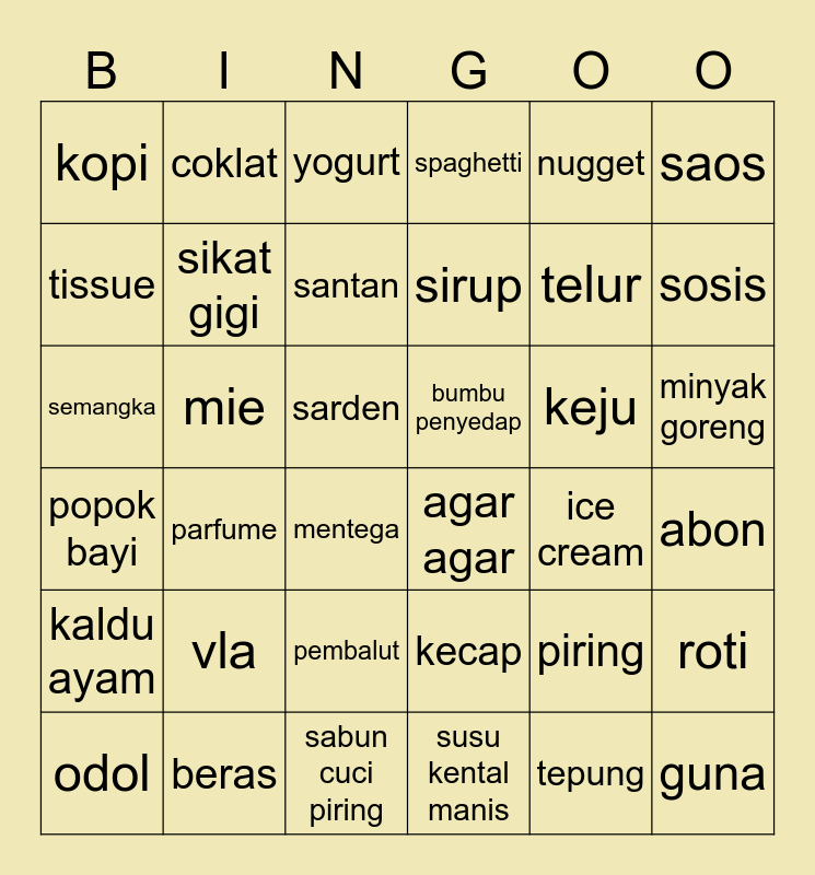 This bingo card has 36 words: kecap, pembalut, susu kental manis, tissue, popok bayi, bumbu penyedap, sikat gigi, sabun cuci piring, nugget, piring, sosis, spaghetti, roti, mie, sirup, kopi, kaldu ayam, keju, semangka, yogurt, sarden, parfume, agar agar, mentega, ice cream, coklat, telur, beras, santan, saos, guna, odol, abon, minyak goreng, vla and tepung.