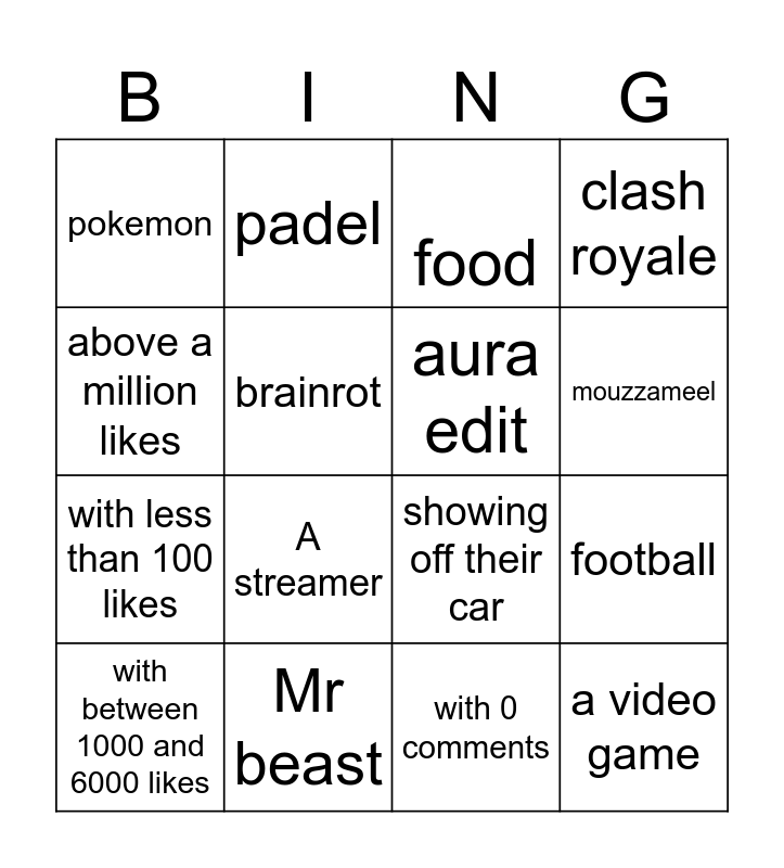 This bingo card has 16 words: Mr beast, football, food, pokemon, with less than 100 likes, padel, showing off their car, with 0 comments, above a million likes, brainrot, with between 1000 and 6000 likes, clash royale, A streamer, mouzzameel, aura edit and a video game.