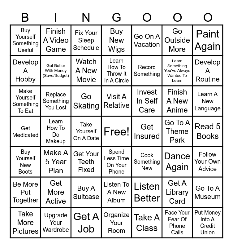 This bingo card has a free space and 48 words: Listen Better, Learn Something You’ve Always Wanted To Learn, Organize Your Room, Learn How To Do Makeup, Go Skating, Read 5 Books, Finish A Video Game, Upgrade Your Wardrobe, Go Outside More, Spend Less Time On Your Phone, Paint Again, Buy New Wigs, Finish A New Anime, Invest In Self Care, Be More Put Together, Go To A Theme Park, Develop A Hobby, Develop A Routine, Get A Library Card, Go On A Vacation, Record Something, Take Yourself On A Date, Buy Yourself Something Useful, Get Better With Money (Save/Budget), Go To A Museum, Watch A New Movie, Learn A New Language, Take More Pictures, Visit A Relative, Replace Something You Lost, Face Your Fear Of Phone Calls, Get Insured, Follow Your Own Advice, Get More Active, Get Medicated, Cook Something New, Dance Again, Make Yourself Something To Eat, Get Your Teeth Fixed, Buy A Suitcase, Buy Yourself New Boots, Put Money Into A Credit Union, Fix Your Sleep Schedule, Get A Job, Learn How To Throw It In A Circle, Listen To A New Album, Make A 5 Year Plan and Take A Class.