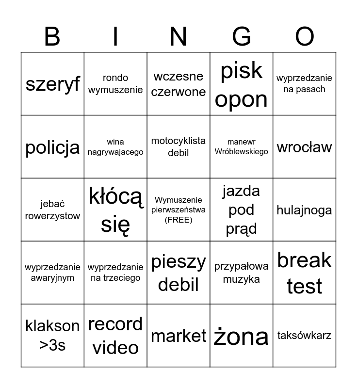 This bingo card has a free space and 24 words: wyprzedzanie na trzeciego, record video, motocyklista debil, klakson >3s, wyprzedzanie na pasach, szeryf, policja, rondo wymuszenie, jazda pod prąd, pieszy debil, manewr Wróblewskiego, jebać rowerzystow, przypałowa muzyka, break test, wina nagrywajacego, żona, hulajnoga, wczesne czerwone, wrocław, kłócą się, taksówkarz, wyprzedzanie awaryjnym, pisk opon and market.