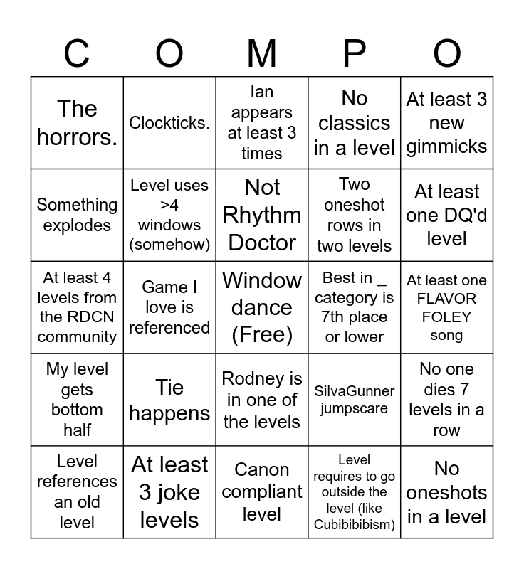 This bingo card has a free space and 24 words: Tie happens, At least 3 joke levels, Not Rhythm Doctor, Level references an old level, At least 3 new gimmicks, The horrors., Something explodes, Clockticks., Best in _ category is 7th place or lower, Rodney is in one of the levels, Two oneshot rows in two levels, At least 4 levels from the RDCN community, SilvaGunner jumpscare, No one dies 7 levels in a row, Level uses >4 windows (somehow), Level requires to go outside the level (like Cubibibibism), At least one FLAVOR FOLEY song, Ian appears at least 3 times, At least one DQ'd level, Game I love is referenced, No oneshots in a level, My level gets bottom half, No classics in a level and Canon compliant level.
