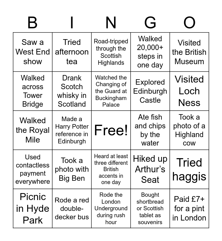 This bingo card has a free space and 25 words: Took a photo with Big Ben, Rode the London Underground during rush hour, Watched the Changing of the Guard at Buckingham Palace, Picnic in Hyde Park, Visited the British Museum, Saw a West End show, Walked across Tower Bridge, Tried afternoon tea, Ate fish and chips by the water, Heard at least three different British accents in one day, Explored Edinburgh Castle, Walked the Royal Mile, Hiked up Arthur’s Seat, Tried haggis, Drank Scotch whisky in Scotland, Experienced rain and sunshine within the same hour, Took a photo of a Highland cow, Road-tripped through the Scottish Highlands, Visited Loch Ness, Made a Harry Potter reference in Edinburgh, Paid £7+ for a pint in London, Rode a red double-decker bus, Used contactless payment everywhere, Walked 20,000+ steps in one day and Bought shortbread or Scottish tablet as souvenirs.