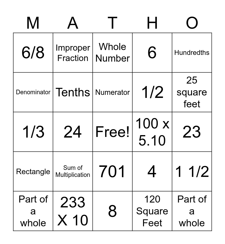 This bingo card has a free space and 24 words: Sum of Multiplication, 233 X 10, Numerator, Part of a whole, Hundredths, 6/8, Denominator, Improper Fraction, 100 x 5.10, 701, 1/2, 1/3, 4, 1 1/2, Tenths, 120 Square Feet, 23, Whole Number, 25 square feet, 24, Part of a whole, Rectangle, 6 and 8.