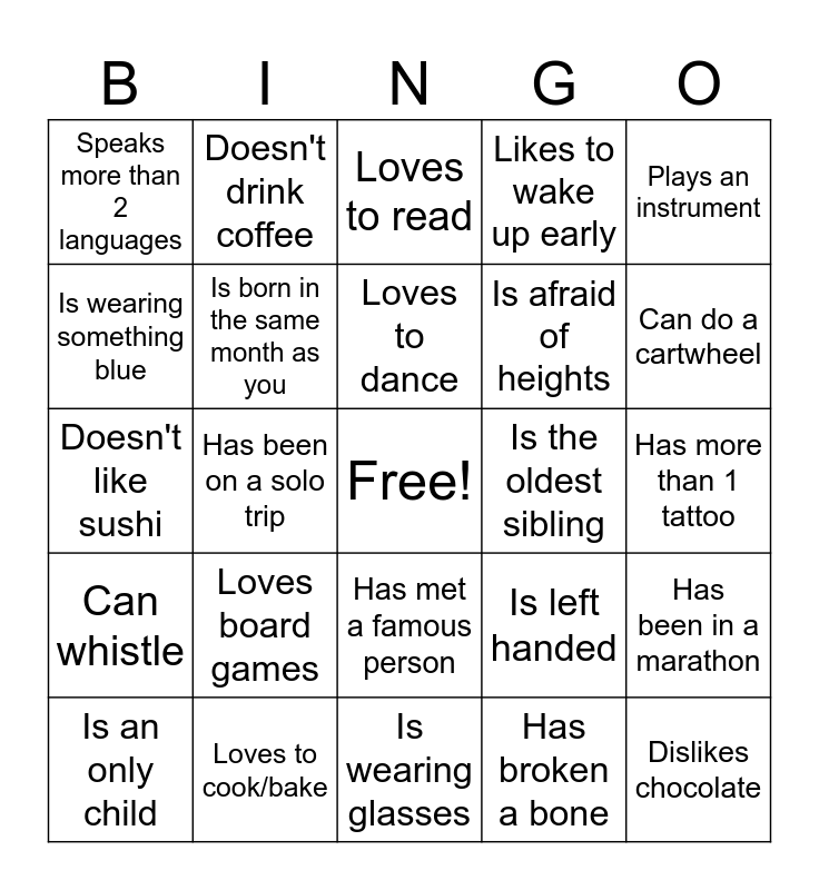This bingo card has a free space and 24 words: Loves board games, Loves to cook/bake, Loves to dance, Is an only child, Plays an instrument, Speaks more than 2 languages, Is wearing something blue, Doesn't drink coffee, Is the oldest sibling, Has met a famous person, Is afraid of heights, Doesn't like sushi, Is left handed, Has been in a marathon, Is born in the same month as you, Has broken a bone, Has more than 1 tattoo, Loves to read, Can do a cartwheel, Has been on a solo trip, Dislikes chocolate, Can whistle, Likes to wake up early and Is wearing glasses.