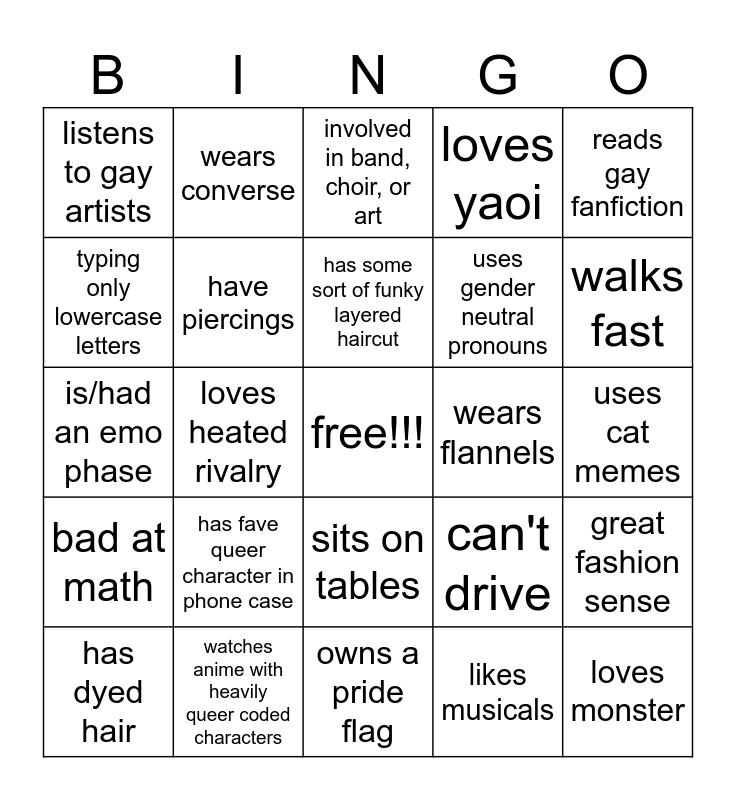 This bingo card has a free space and 29 words: has dyed hair, can't sit correctly, loves heated rivalry, criminal screen time, listens to gay artists, involved in band, choir, or art, have piercings, has fave queer character in phone case, wears flannels, watches anime with heavily queer coded characters, uses cat memes, loves monster, owns a pride flag, likes musicals, walks fast, uses emoticons, sits on tables, bad at math, reads gay fanfiction, is/had an emo phase, can't drive, gets into series cus a character might be gay, uses gender neutral pronouns, typing only lowercase letters, loves yaoi, wears converse, great fashion sense, has some sort of funky layered haircut and has lots of stuff on their walls.