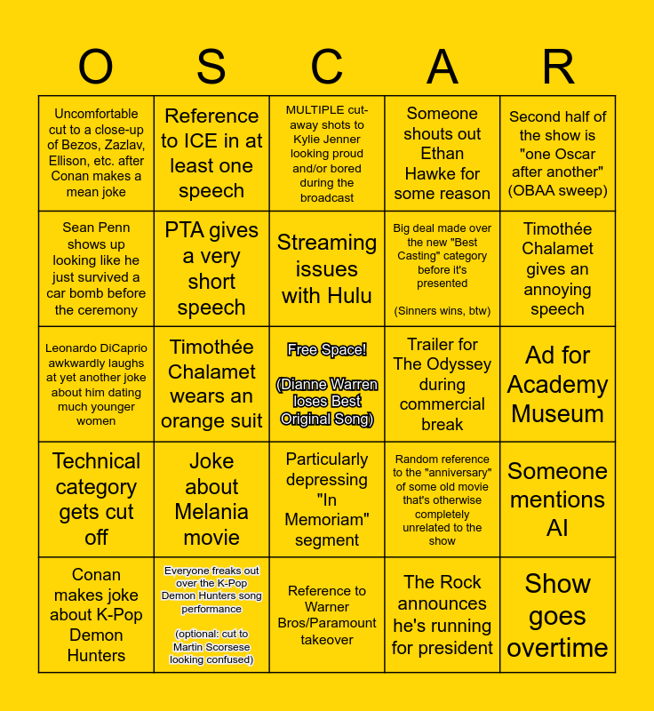This bingo card has a free space and 24 words: Joke about Melania movie, Everyone freaks out over the K-Pop Demon Hunters song performance (optional: cut to Martin Scorsese looking confused), Streaming issues with Hulu, Conan makes joke about K-Pop Demon Hunters, Second half of the show is "one Oscar after another" (OBAA sweep), Uncomfortable cut to a close-up of Bezos, Zazlav, Ellison, etc. after Conan makes a mean joke, Sean Penn shows up looking like he just survived a car bomb before the ceremony, Reference to ICE in at least one speech, Trailer for The Odyssey during commercial break, Particularly depressing "In Memoriam" segment, Big deal made over the new "Best Casting" category before it's presented (Sinners wins, btw), Leonardo DiCaprio awkwardly laughs at yet another joke about him dating much younger women, Random reference to the "anniversary" of some old movie that's otherwise completely unrelated to the show, Someone mentions AI, PTA gives a very short speech, The Rock announces he's running for president, Ad for Academy Museum, MULTIPLE cut-away shots to Kylie Jenner looking proud and/or bored during the broadcast, Timothée Chalamet gives an annoying speech, Timothée Chalamet wears an orange suit, Show goes overtime, Technical category gets cut off, Someone shouts out Ethan Hawke for some reason and Reference to Warner Bros/Paramount takeover.