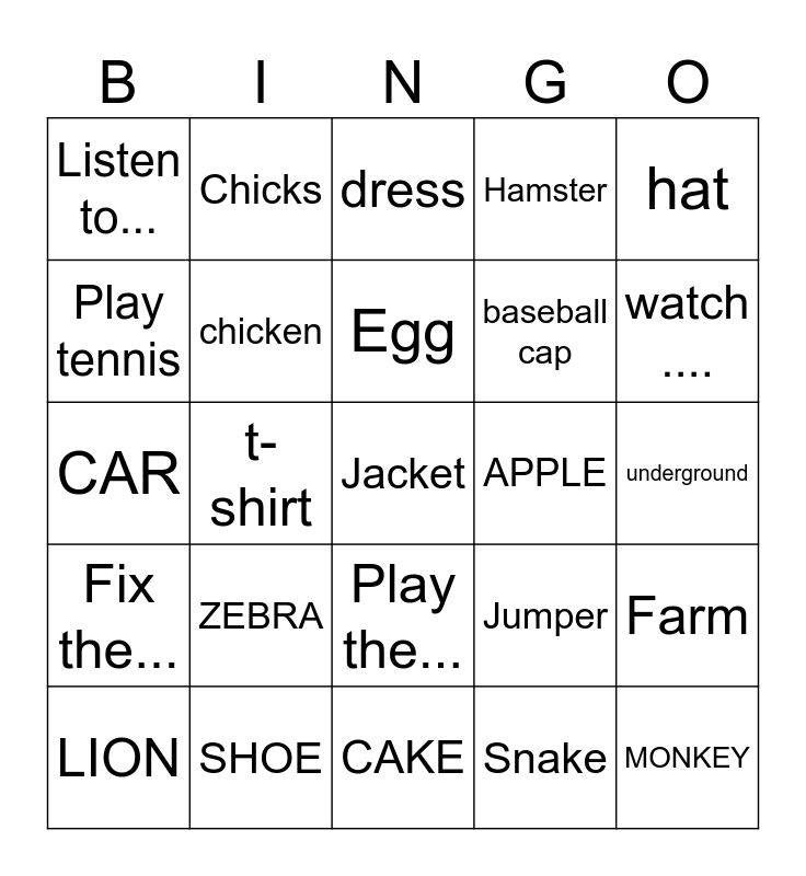 This bingo card has a free space and 29 words: LION, PLANE, t-shirt, horse, Listen to..., dress, chicken, ZEBRA, APPLE, SHOE, underground, MONKEY, CAKE, Snake, watch ...., BIKE, Play the..., Fix the..., hat, CAR, Jumper, Scarf, baseball cap, Play tennis, Hamster, Chicks, Farm, Egg and Brush the....