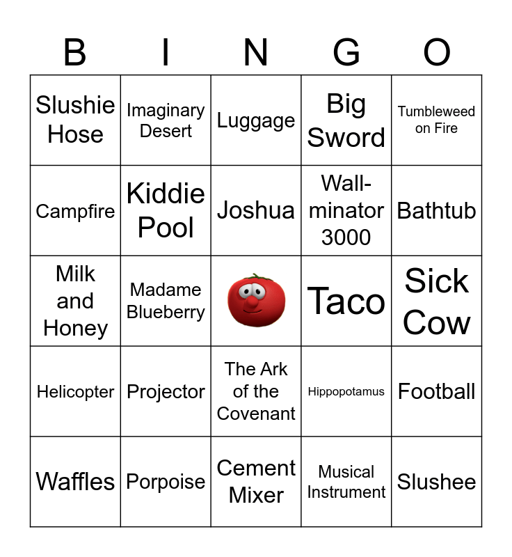 This bingo card has a free space and 32 words: Musical Instrument, Squash, Madame Blueberry, Larry Boy, Helicopter, Kiddie Pool, Tumbleweed on Fire, Football, Imaginary Desert, Map of Egypt, Joshua, Luggage, Ice Cream Sundae, Cupcake, Taco, Birthday Cake with Candles, Waffles, Milk and Honey, The Ark of the Covenant, Projector, Hippopotamus, Bullfight, Sick Cow, Porpoise, Slushee, Big Sword, Wall-minator 3000, Campfire, Slushie Hose, Cement Mixer, Jazz Trumpets and Bathtub.