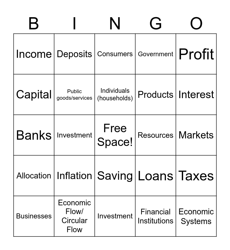 This bingo card has a free space and 24 words: Inflation, Economic Flow/ Circular Flow, Individuals (households), Businesses, Profit, Income, Capital, Deposits, Resources, Saving, Products, Banks, Loans, Taxes, Public goods/services, Financial Institutions, Markets, Consumers, Interest, Investment, Economic Systems, Allocation, Government and Investment.