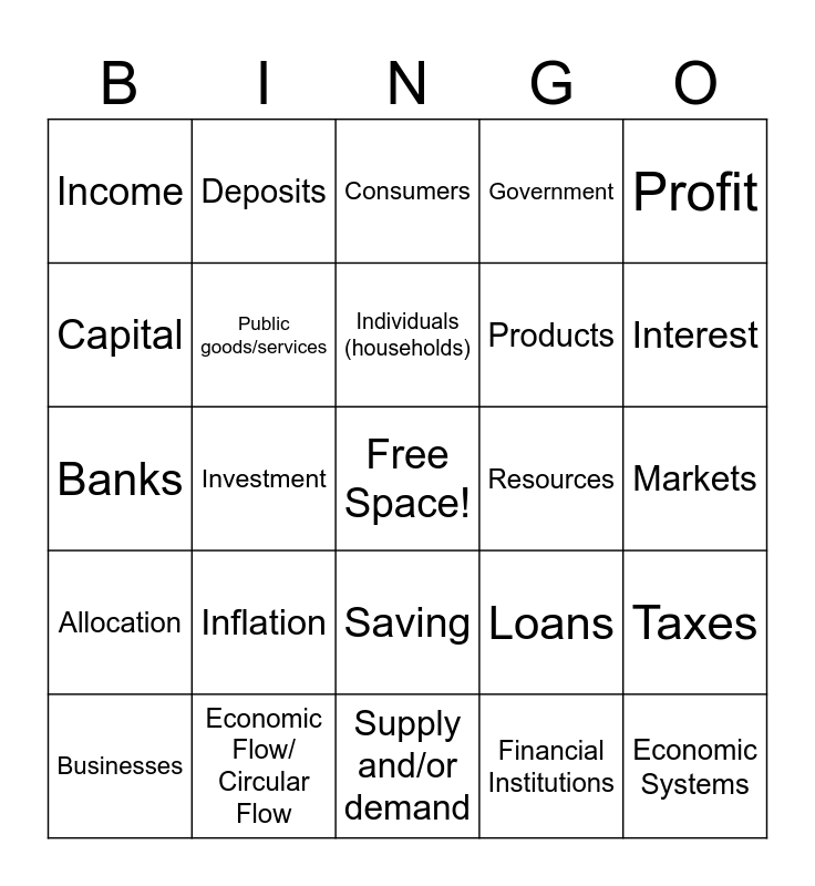 This bingo card has a free space and 24 words: Inflation, Economic Flow/ Circular Flow, Individuals (households), Businesses, Profit, Income, Capital, Deposits, Resources, Saving, Products, Banks, Loans, Taxes, Public goods/services, Financial Institutions, Markets, Consumers, Interest, Investment, Economic Systems, Allocation, Government and Supply and/or demand.