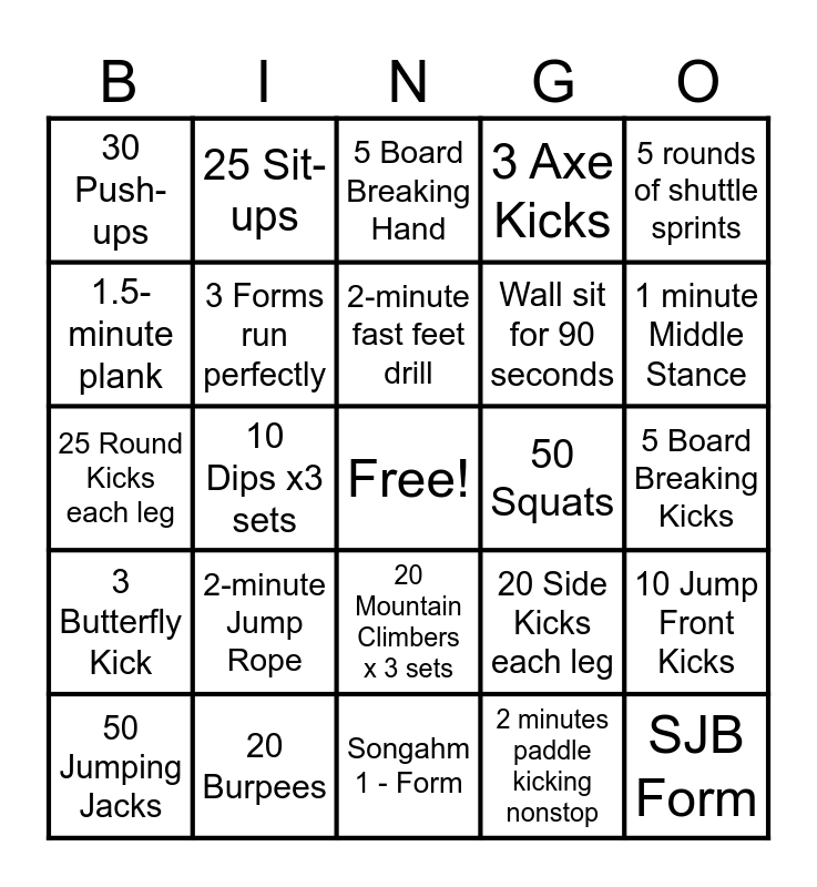 This bingo card has a free space and 24 words: 2-minute Jump Rope, 20 Burpees, 2-minute fast feet drill, 50 Jumping Jacks, 5 rounds of shuttle sprints, 30 Push-ups, 1.5-minute plank, 25 Sit-ups, 50 Squats, 20 Mountain Climbers x 3 sets, Wall sit for 90 seconds, 25 Round Kicks each leg, 20 Side Kicks each leg, 10 Jump Front Kicks, 3 Forms run perfectly, 2 minutes paddle kicking nonstop, 5 Board Breaking Kicks, 5 Board Breaking Hand, 1 minute Middle Stance, 10 Dips x3 sets, SJB Form, 3 Butterfly Kick, 3 Axe Kicks and Songahm 1 - Form.