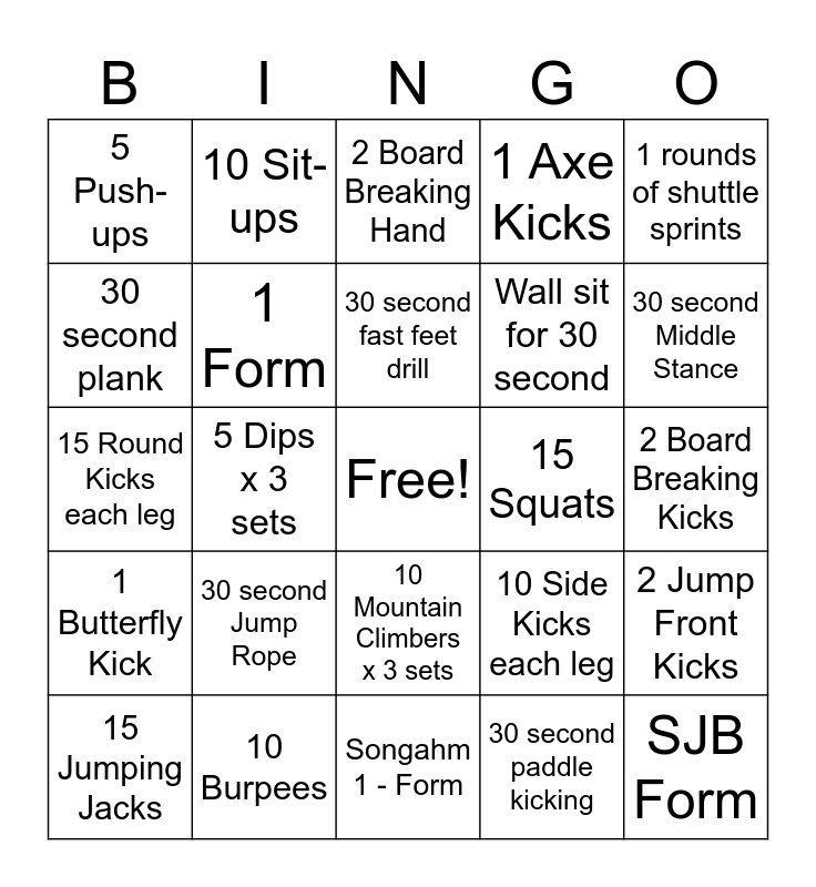 This bingo card has a free space and 24 words: 30 second Jump Rope, 10 Burpees, 30 second fast feet drill, 15 Jumping Jacks, 1 rounds of shuttle sprints, 5 Push-ups, 30 second plank, 10 Sit-ups, 15 Squats, 10 Mountain Climbers x 3 sets, Wall sit for 30 second, 15 Round Kicks each leg, 10 Side Kicks each leg, 2 Jump Front Kicks, 1 Form, 30 second paddle kicking, 2 Board Breaking Kicks, 2 Board Breaking Hand, 30 second Middle Stance, 5 Dips x 3 sets, SJB Form, 1 Butterfly Kick, 1 Axe Kicks and Songahm 1 - Form.