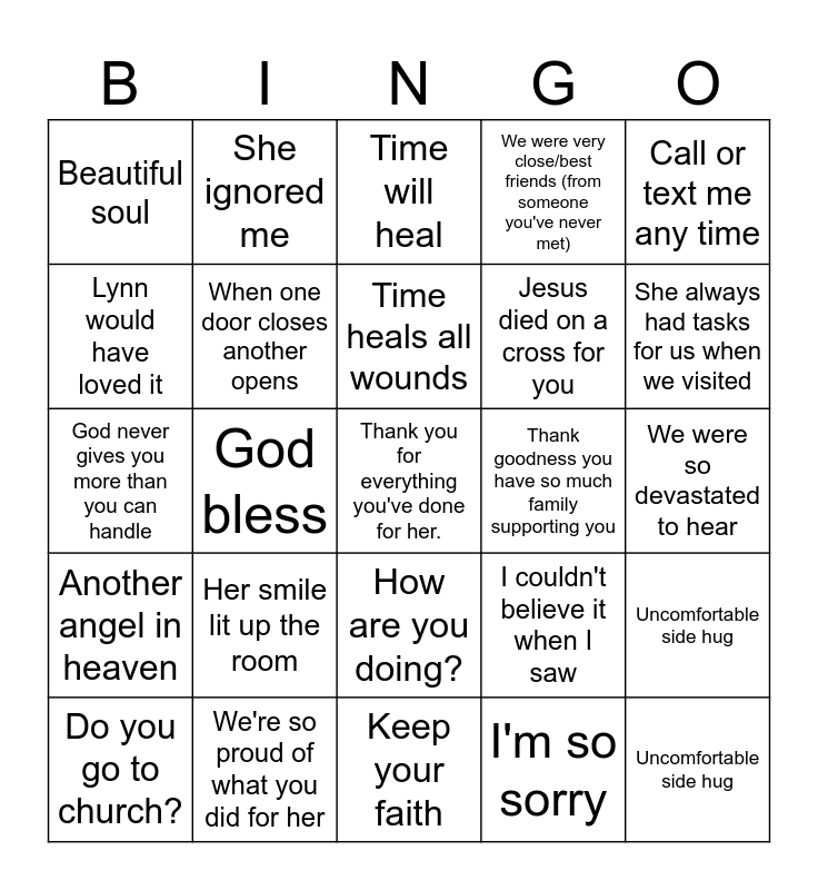 This bingo card has a free space and 54 words: Free!, Another angel in heaven, Thoughts and prayers, She's in a better place now, How are you doing?, Forever in our hearts, We were very close/best friends (from someone you've never met), What a beautiful ceremony, Lynn would have loved it, Was she comfortable/ in pain?, Beautiful soul, I can't imagine, We're so proud of what you did for her, Do you go to church?, God will bring you comfort, Keep your faith, Uncomfortable side hug, Jesus died on a cross for you, If you need anything, please let me know, We were so devastated to hear, I couldn't believe it when I saw, She said you were a terrible kid, but look at you now!, Thank goodness you have so much family supporting you, Call or text me any time, I wish we could have come by, She ignored me, Sorry to see you under these circumstances, We should keep in touch, She was a fighter, I'm so sorry, You are both so strong, She was so young, Gone too soon, You're holding up so well, Time will heal, She was so loved, God never gives you more than you can handle, Uncomfortable side hug, I never met Lynn but…, When one door closes another opens, Only the good die young, She lived her life to the fullest, At least the weather is nice/the rain is fitting, You can take comfort in, Her smile lit up the room, Heart of gold, We've been praying for you, She's watching over you, Time heals all wounds, God bless, She always had tasks for us when we visited, Deepest condolecences, I know how you feel and It could have been so much worse.