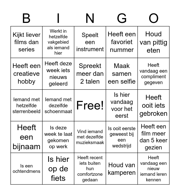This bingo card has a free space and 24 words: Is deze week te laat gekomen op werk, Is hier op de fiets, Spreekt meer dan 2 talen, Is een ochtendmens, Houd van pittig eten, Kijkt liever films dan series, Heeft een creatieve hobby, Werkt in hetzelfde vakgebied als iemand hier, Is hier vandaag voor het eerst, Vind iemand met dezelfde muzieksmaak, Maak samen een selfie, Iemand met hetzelfde sterrenbeeld, Is ooit eerste geweest bij een wedstrijd, Heeft een film meer dan 5 keer gezien, Heeft deze week iets nieuws geleerd, Houd van kamperen, Heeft ooit iets gebroken, Speelt een instrument, Heeft vandaag een compliment gegeven, Iemand met dezelfde schoenmaat, Heeft vandaag een nieuw iemand leren kennen, Heeft een bijnaam, Heeft een favoriet nummer and Heeft recent iets buiten hun comfortzone gedaan.