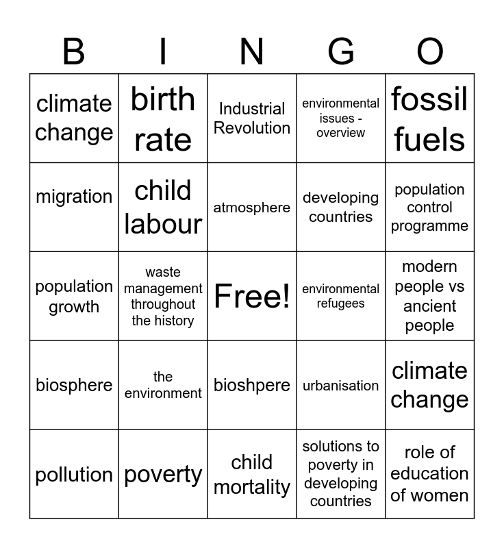 This bingo card has a free space and 24 words: the environment, poverty, atmosphere, pollution, fossil fuels, climate change, migration, birth rate, environmental refugees, bioshpere, developing countries, population growth, urbanisation, climate change, child labour, solutions to poverty in developing countries, modern people vs ancient people, Industrial Revolution, population control programme, waste management throughout the history, role of education of women, biosphere, environmental issues - overview and child mortality.