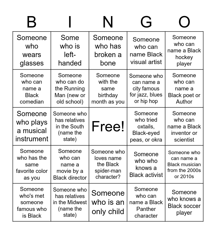 This bingo card has a free space and 24 words: Someone who can name a movie by a Black director, Someone who has relatives in the Midwest (name the state), Someone with the same birthday month as you, Someone who's met someone famous who is Black, Someone who can name a Black hockey player, Someone who wears glasses, Someone who can name a Black comedian, Some who is left-handed, Someone who tried oxtails, Black-eyed peas, or okra, Someone who loves name the Black spider-man character?, Someone who can name a city famous for jazz, blues or hip hop, Someone who plays a musical instrument, Someone who who knows a Black activist, Someone who can name a Black musician from the 2000s or 2010s, Someone who can do the Running Man (new or old school), Someone who can name a Black Panther character, Someone who can name a Black inventor or scientist, Someone who has broken a bone, Someone who can name a Black poet or Author, Someone who has relatives in the South (name the state), Someone who knows a Black soccer player, Someone who has the same favorite color as you, Someone who can name Black visual artist and Someone who is an only child.