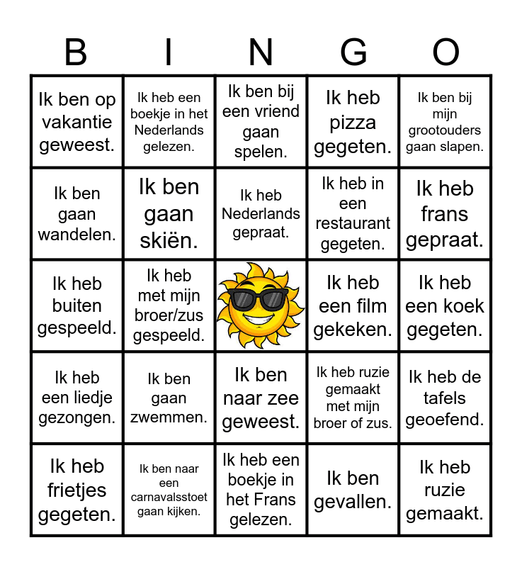 This bingo card has a free space and 24 words: Ik ben gaan zwemmen., Ik ben naar een carnavalsstoet gaan kijken., Ik heb Nederlands gepraat., Ik heb frietjes gegeten., Ik ben bij mijn grootouders gaan slapen., Ik ben op vakantie geweest., Ik ben gaan wandelen., Ik heb een boekje in het Nederlands gelezen., Ik heb een film gekeken., Ik ben naar zee geweest., Ik heb in een restaurant gegeten., Ik heb buiten gespeeld., Ik heb ruzie gemaakt met mijn broer of zus., Ik heb de tafels geoefend., Ik ben gaan skiën., Ik ben gevallen., Ik heb een koek gegeten., Ik ben bij een vriend gaan spelen., Ik heb frans gepraat., Ik heb met mijn broer/zus gespeeld., Ik heb ruzie gemaakt., Ik heb een liedje gezongen., Ik heb pizza gegeten. and Ik heb een boekje in het Frans gelezen..