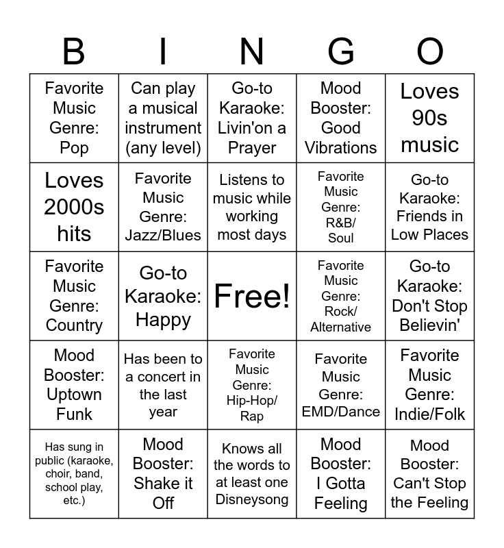 This bingo card has a free space and 25 words: Has been to a concert in the last year, Knows all the words to at least one Disneysong, Listens to music while working most days, Has sung in public (karaoke, choir, band, school play, etc.), Loves 90s music, Favorite Music Genre: Pop, Loves 2000s hits, Can play a musical instrument (any level), Favorite Music Genre: Rock/ Alternative, Favorite Music Genre: Hip-Hop/ Rap, Favorite Music Genre: R&B/ Soul, Favorite Music Genre: Country, Favorite Music Genre: EMD/Dance, Favorite Music Genre: Indie/Folk, Favorite Music Genre: Jazz/Blues, Go-to Karaoke: Sweet Caroline, Go-to Karaoke: Don't Stop Believin', Go-to Karaoke: Livin'on a Prayer, Go-to Karaoke: Friends in Low Places, Go-to Karaoke: Happy, Mood Booster: Can't Stop the Feeling, Mood Booster: Shake it Off, Mood Booster: Uptown Funk, Mood Booster: Good Vibrations and Mood Booster: I Gotta Feeling.