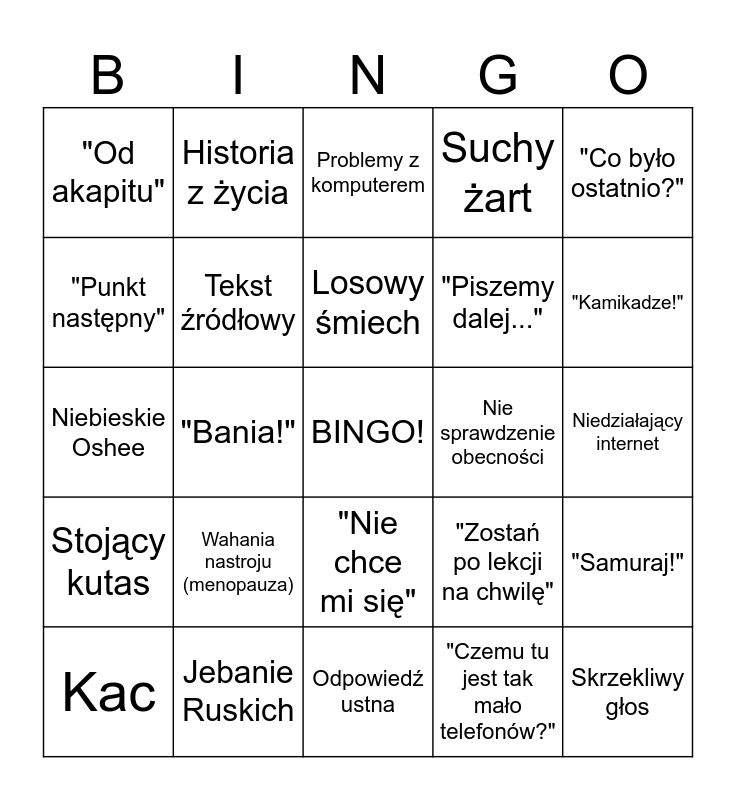 This bingo card has a free space and 24 words: Wahania nastroju (menopauza), Jebanie Ruskich, Losowy śmiech, Kac, "Co było ostatnio?", "Od akapitu", "Punkt następny", Historia z życia, Nie sprawdzenie obecności, "Nie chce mi się", "Piszemy dalej...", Niebieskie Oshee, "Zostań po lekcji na chwilę", "Samuraj!", Tekst źródłowy, "Czemu tu jest tak mało telefonów?", Niedziałający internet, Problemy z komputerem, "Kamikadze!", "Bania!", Skrzekliwy głos, Stojący kutas, Suchy żart and Odpowiedź ustna.