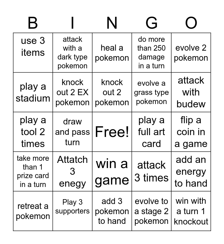 This bingo card has a free space and 24 words: Attatch 3 enegy, Play 3 supporters, knock out 2 pokemon, retreat a pokemon, evolve 2 pokemon, use 3 items, play a stadium, attack with a dark type pokemon, play a full art card, win a game, evolve a grass type pokemon, play a tool 2 times, attack 3 times, add an energy to hand, knock out 2 EX pokemon, evolve to a stage 2 pokemon, flip a coin in a game, heal a pokemon, attack with budew, draw and pass turn, win with a turn 1 knockout, take more than 1 prize card in a turn, do more than 250 damage in a turn and add 3 pokemon to hand.