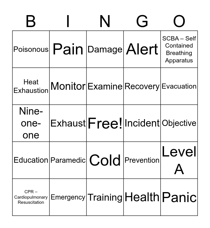 This bingo card has a free space and 118 words: Accident, Activity, Adrenaline, AED – Automated External Defibrillator, Aid, Alarm, Alert, Ambulance, Assess, Awareness, Barricade, Biological Agents, Bug Spray, Catastrophe, Caution, Chemicals, Cold, Communication, Contaminants, Corrosive, CPR – Cardiopulmonary Resuscitation, Damage, Danger, Detector, Dispatch, Education, Emergency, Emergency Action Plan, Emergency Response, Ergonomics, Evacuation, Examine, Exhaust, Exit Route, Falls, Fatigue, Fitness, Fire Extinguisher, First Aid, Flu, Gauge, Gloves, Hard Hat, Harmful, Hazards, HAZWOPER – Hazardous Waste Operations & Emergency Response, Health, Heat Exhaustion, Hesitation, Hop Reflex, Hypothermia, Incident, Informed, Inhalation, Injury, Inspect, Insurance, Investigate, Judgment, Knowledge, Level A, Level B, Level C, Level D, Measure, Medical Attention, Misstep, Monitor, Nine-one-one, Notify, Objective, Observant, Obstacles, Outbreak, Oxygen, Pain, Panic, Paramedic, Poisonous, Police, Potent, PPE – Personal Protective Equipment, Practice Drill, Preparation, Prevention, Questions, Recovery, Regulations, Report, Rescue, Responsibility, Risk, Safety, Safety Goggles, Safety Vest, SCBA – Self Contained Breathing Apparatus, Search and Rescue, Sirens, Slips, Smoke, Steel-toed Boots, Stingray Shuffle, Strategy, Stress, Sunscreen, Supplies, Tools, Toxic, Tornado Shelter, Traffic Cone, Training, Trips, Underhand Rail Grip, Unidentified Substance, Unsafe, Venomous, Ventilation and Wound.
