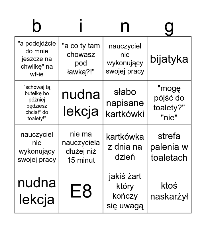 This bingo card has 25 words: "schowaj ten telefon!!!!", "napisz do mnie na librusie!", "mogę pójść do toalety?" "nie", strefa palenia w toaletach, "schowaj tą butelkę bo później będziesz chciał* do toalety!", "a podejdźcie do mnie jeszcze na chwilkę" na wf-ie, nudna lekcja, "a co ty tam chowasz pod ławką?!", E8, odpowie-dzialność zbiorowa, nauczyciel nie wykonujący swojej pracy, kartkówka z dnia na dzień, akcja w łazienkach (rzadkie), "dlaczego wy się nie uczycie?", słabo napisane kartkówki, "chcesz się czymś podzielić z klasą?", jakiś żart który kończy się uwagą, nauczyciel nie wykonujący swojej pracy, nie ma nauczyciela dłużej niż 15 minut, strefa palenia w toaletach, nudna lekcja, nie ma nauczyciela ale nie wiedzieli o tym przed naszymi lekcjami więc jest zastępstwo, ktoś naskarżył, bijatyka and bieganina.