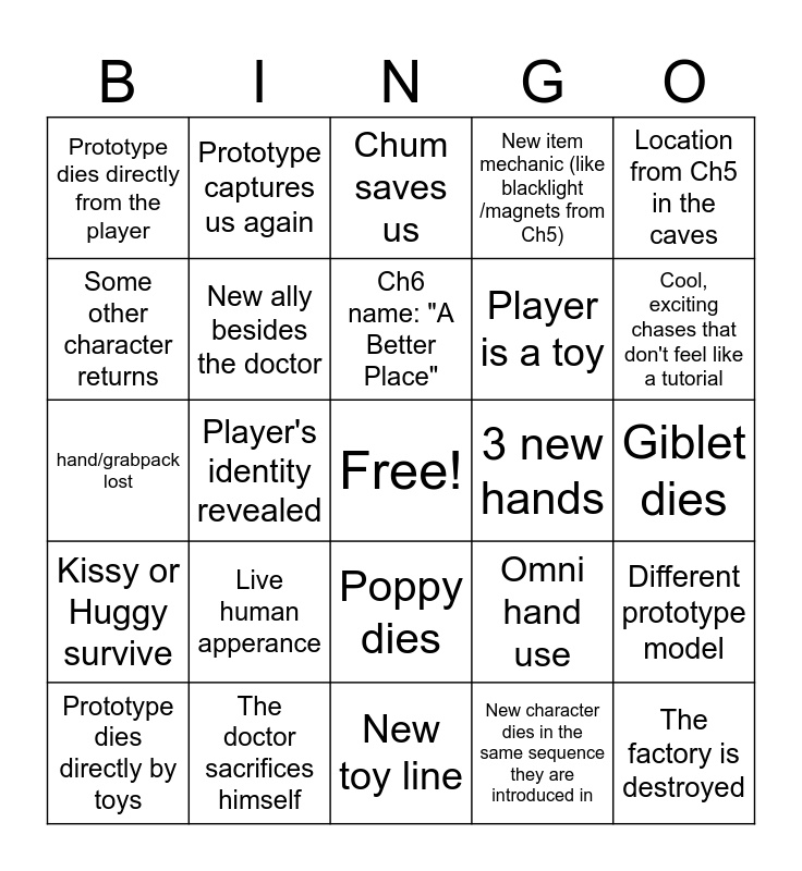 This bingo card has a free space and 24 words: Live human apperance, The doctor sacrifices himself, Ch6 name: "A Better Place", Prototype dies directly by toys, Location from Ch5 in the caves, Prototype dies directly from the player, Some other character returns, Prototype captures us again, 3 new hands, Poppy dies, Player is a toy, hand/grabpack lost, Omni hand use, Different prototype model, New ally besides the doctor, New character dies in the same sequence they are introduced in, Giblet dies, Chum saves us, Cool, exciting chases that don't feel like a tutorial, Player's identity revealed, The factory is destroyed, Kissy or Huggy survive, New item mechanic (like blacklight /magnets from Ch5) and New toy line.