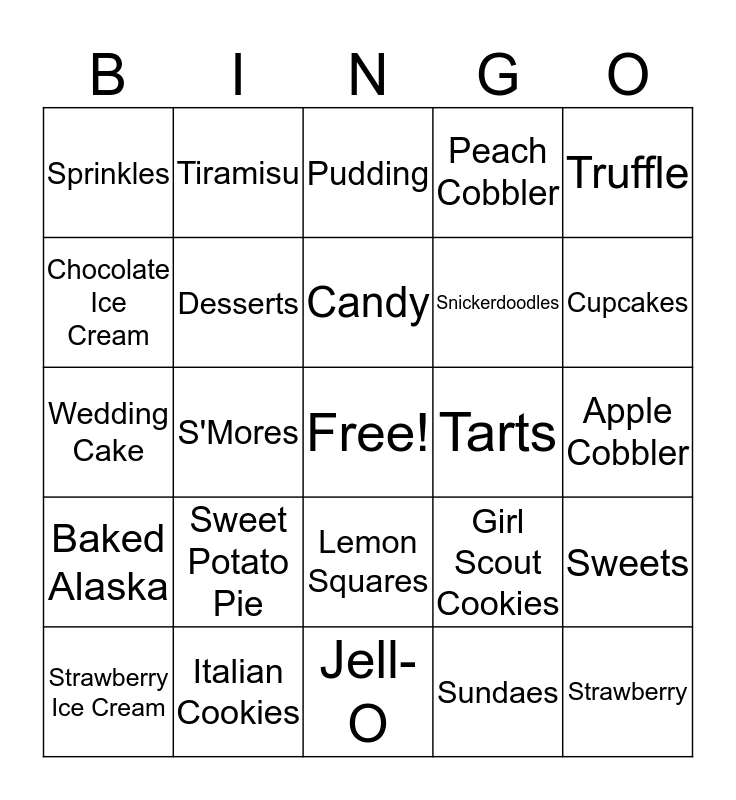 This bingo card has a free space and 33 words: Chocolate Chips, Brownies, S'Mores, Vanilla Ice Cream, Baked Alaska, Desserts, Truffle, Strawberry Ice Cream, Tiramisu, Bread Pudding, Candy, Pudding, Apple Pie, Fresh Fruits, Tarts, Cupcakes, Italian Cookies, Wedding Cake, Sweet Potato Pie, Girl Scout Cookies, Lemon Squares, Pumpkin Pie, Sprinkles, Apple Cobbler, Jell-O, Strawberry, Peach Cobbler, Snickerdoodles, Chocolate Ice Cream, Sweets, Donuts, Sundaes and Chocolate Chips.