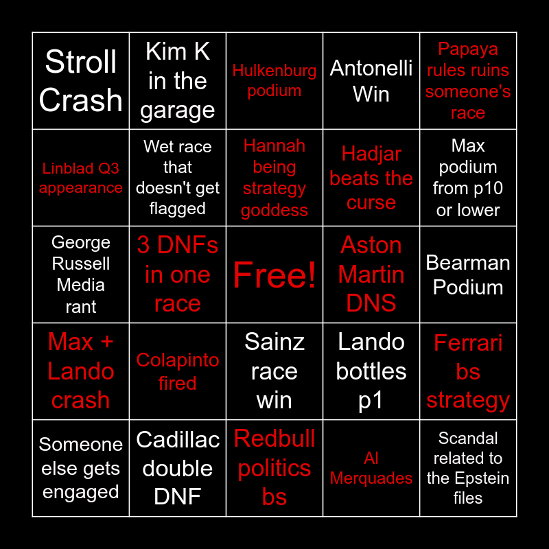 This bingo card has a free space and 24 words: Colapinto fired, Cadillac double DNF, Hannah being strategy goddess, Someone else gets engaged, Papaya rules ruins someone's race, Stroll Crash, Linblad Q3 appearance, Kim K in the garage, Aston Martin DNS, Sainz race win, Hadjar beats the curse, George Russell Media rant, Lando bottles p1, Ferrari bs strategy, Wet race that doesn't get flagged, Al Merquades, Bearman Podium, Hulkenburg podium, Max podium from p10 or lower, 3 DNFs in one race, Scandal related to the Epstein files, Max + Lando crash, Antonelli Win and Redbull politics bs.