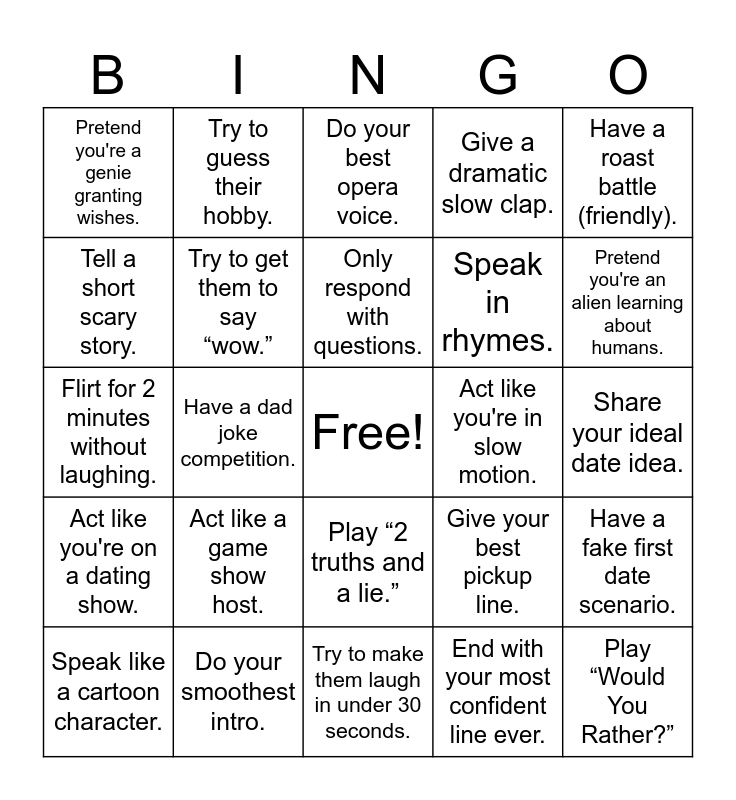 This bingo card has a free space and 25 words: Act like a game show host., Try to make them laugh in under 30 seconds., Only respond with questions., Speak like a cartoon character., Have a roast battle (friendly)., Pretend you're a genie granting wishes., Tell a short scary story., Try to guess their hobby., Act like you're in slow motion., Play “2 truths and a lie.”, Speak in rhymes., Flirt for 2 minutes without laughing., Give your best pickup line., Have a fake first date scenario., Try to get them to say “wow.”, Maintain intense eye contact for 30 seconds., Share your ideal date idea., Do your best opera voice., Pretend you're an alien learning about humans., Have a dad joke competition., Play “Would You Rather?”, Do your smoothest intro., Act like you're on a dating show., Give a dramatic slow clap. and End with your most confident line ever..
