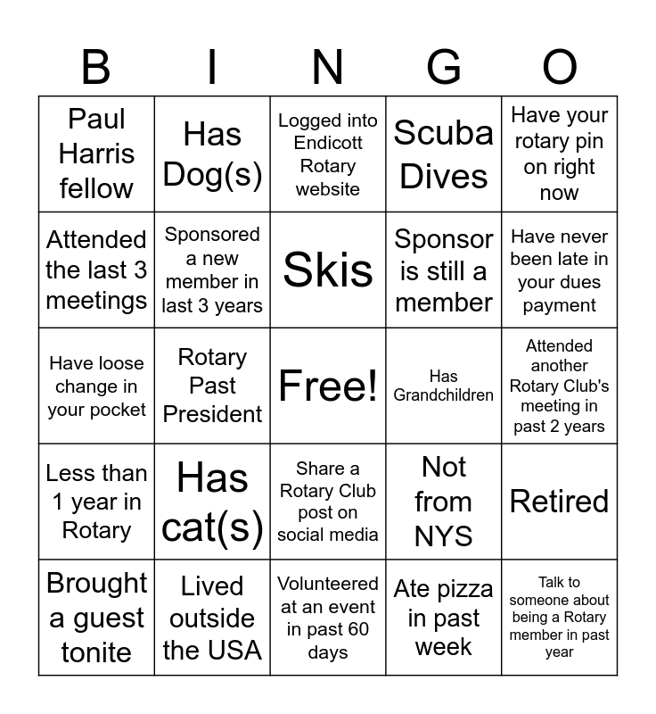 This bingo card has a free space and 29 words: Brought a guest tonite, Read the February issue of Rotary Magazine, Rotary Past President, Attended one District event in last year, Paul Harris fellow, Logged into Endicott Rotary website, Sponsored a new member in last 3 years, Has cat(s), Has Grandchildren, Lived outside the USA, Attended another Rotary Club's meeting in past 2 years, Talk to someone about being a Rotary member in past year, Volunteered at an event in past 60 days, Ate pizza in past week, Have never been late in your dues payment, Have been out of state in past 6 months, Share a Rotary Club post on social media, Less than 1 year in Rotary, Have your rotary pin on right now, Have loose change in your pocket, Not from NYS, A Teacher, Sponsor is still a member, Attended the last 3 meetings, Scuba Dives, Has Dog(s), Retired, Skis and Parachuted.