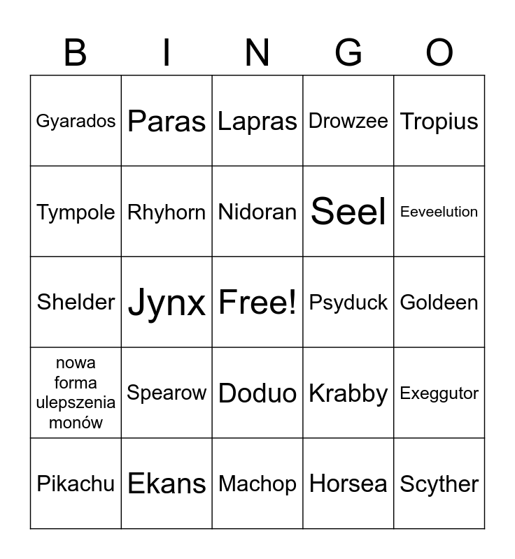 This bingo card has a free space and 24 words: Spearow, Ekans, Nidoran, Pikachu, Tropius, Gyarados, Tympole, Paras, Psyduck, Doduo, Seel, Shelder, Krabby, Exeggutor, Rhyhorn, Horsea, Goldeen, Lapras, Eeveelution, Jynx, Scyther, nowa forma ulepszenia monów, Drowzee and Machop.
