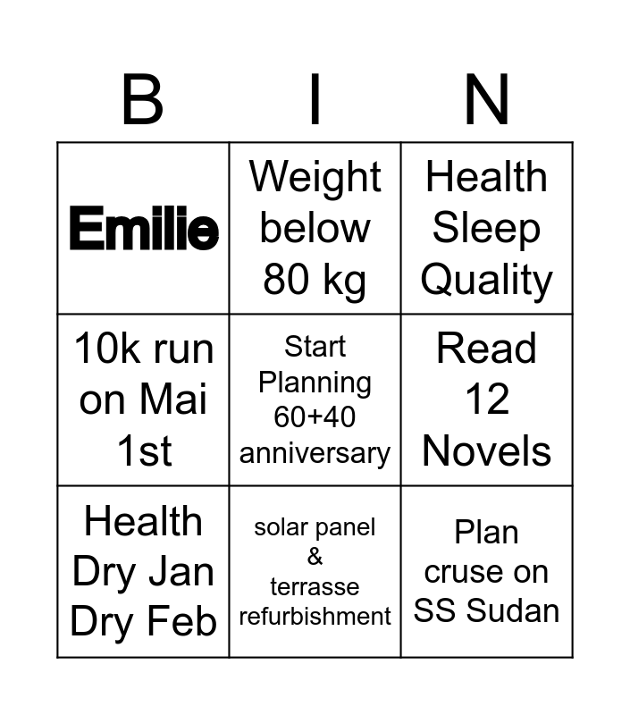 This bingo card has 9 words: Health Dry Jan Dry Feb, Health Sleep Quality, Weight below 80 kg, 10k run on Mai 1st, Emilie, Read 12 Novels, Start Planning 60+40 anniversary, Plan cruse on SS Sudan and solar panel & terrasse refurbishment.
