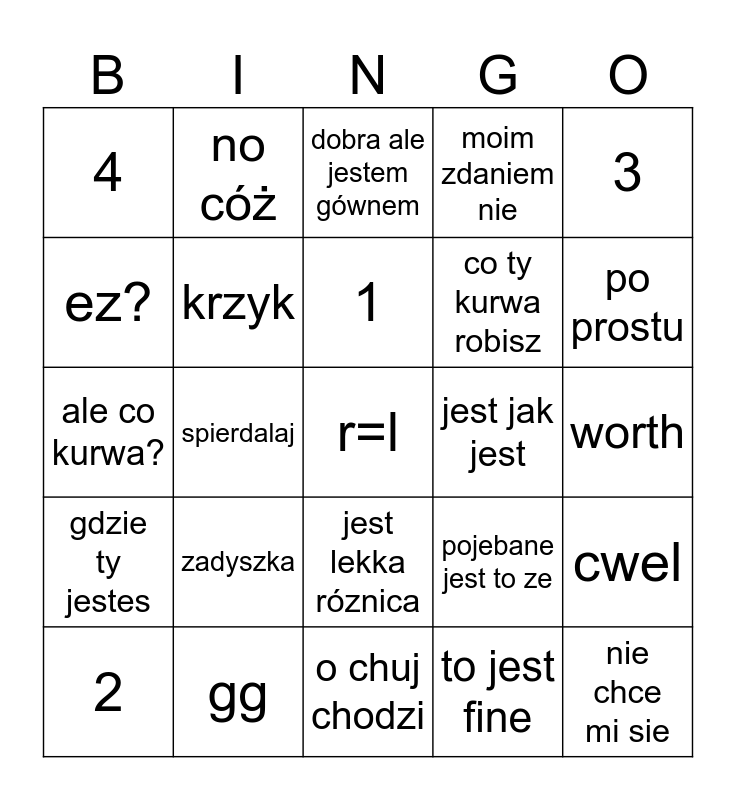 This bingo card has a free space and 24 words: zadyszka, gg, 1, 2, 3, 4, ez?, no cóż, jest jak jest, jest lekka róznica, co ty kurwa robisz, ale co kurwa?, pojebane jest to ze, cwel, krzyk, to jest fine, worth, dobra ale jestem gównem, po prostu, spierdalaj, nie chce mi sie, gdzie ty jestes, moim zdaniem nie and o chuj chodzi.