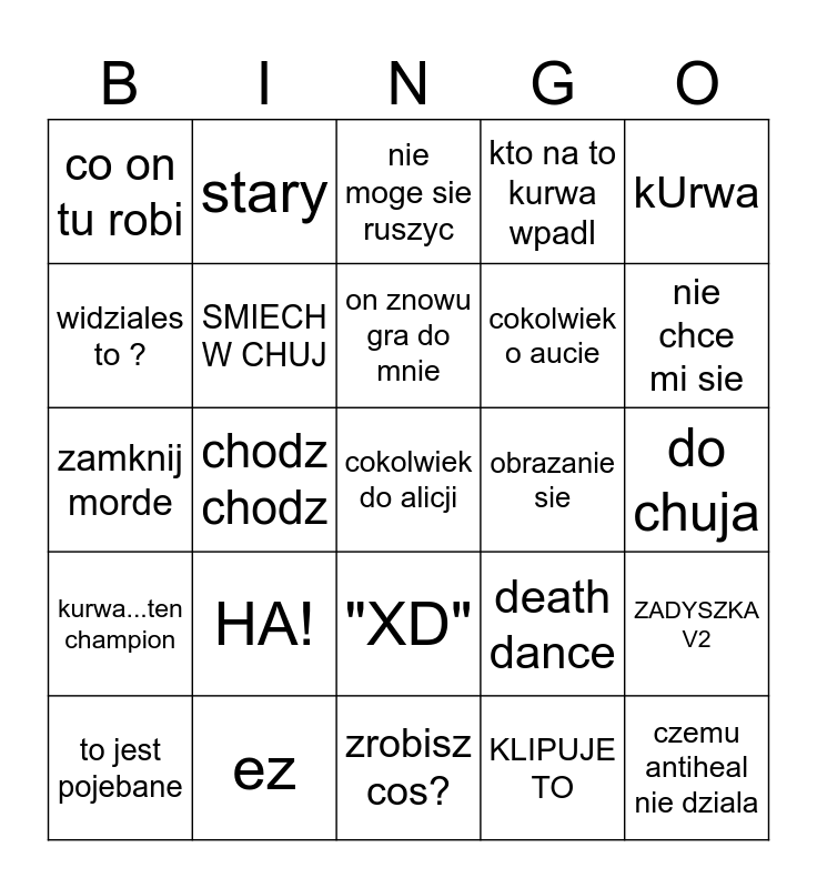 This bingo card has a free space and 24 words: HA!, ez, on znowu gra do mnie, to jest pojebane, kUrwa, co on tu robi, widziales to ?, stary, obrazanie sie, "XD", cokolwiek o aucie, zamknij morde, death dance, ZADYSZKA V2, SMIECH W CHUJ, KLIPUJE TO, do chuja, nie moge sie ruszyc, nie chce mi sie, chodz chodz, czemu antiheal nie dziala, kurwa...ten champion, kto na to kurwa wpadl and zrobisz cos?.