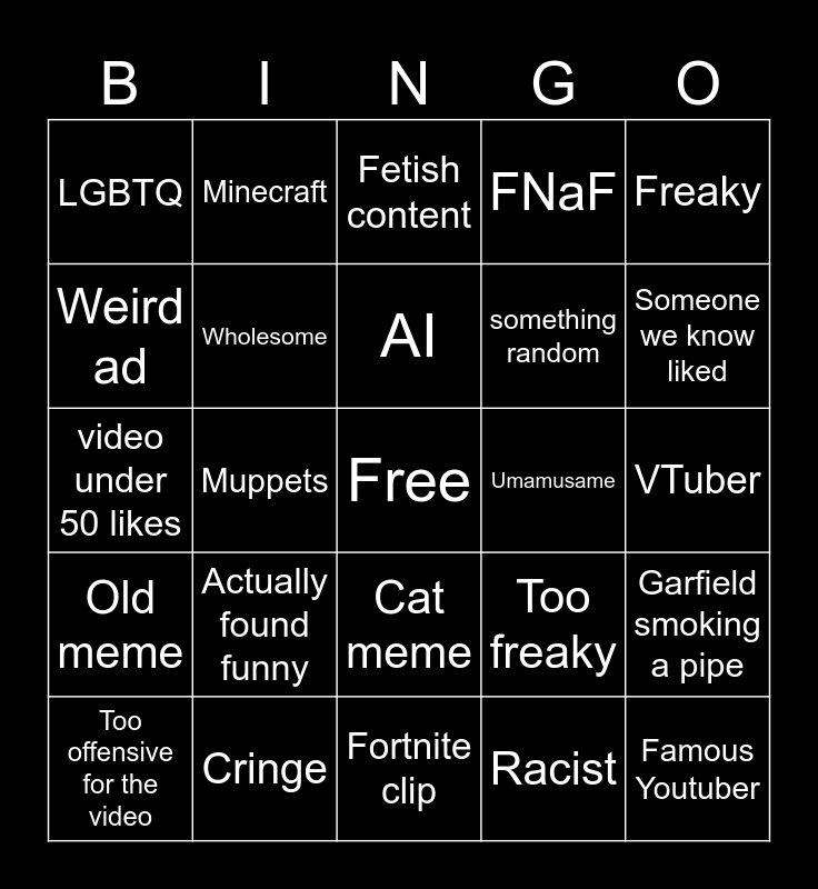 This bingo card has a free space and 24 words: Actually found funny, Cringe, AI, Too offensive for the video, Freaky, LGBTQ, Weird ad, Minecraft, Umamusame, Cat meme, something random, video under 50 likes, Too freaky, Garfield smoking a pipe, Wholesome, Racist, VTuber, Fetish content, Someone we know liked, Muppets, Famous Youtuber, Old meme, FNaF and Fortnite clip.