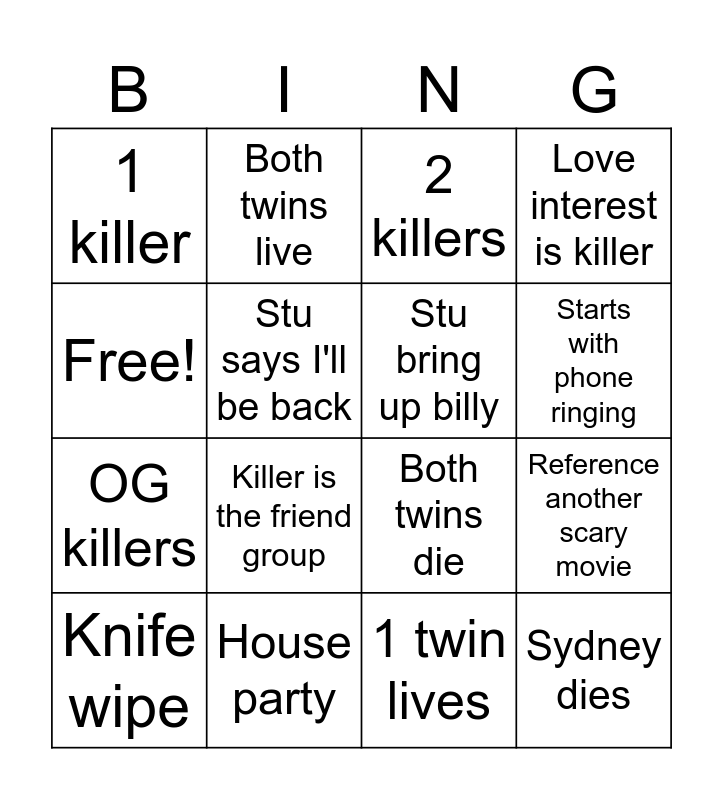 This bingo card has 16 words: House party, Reference another scary movie, 2 killers, 1 killer, OG killers, Both twins live, Both twins die, 1 twin lives, Free!, Stu says I'll be back, Knife wipe, Love interest is killer, Killer is the friend group, Starts with phone ringing, Stu bring up billy and Sydney dies.