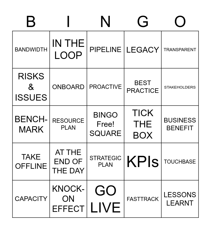 This bingo card has a free space and 24 words: AT THE END OF THE DAY, KNOCK-ON EFFECT, PROACTIVE, CAPACITY, TRANSPARENT, BANDWIDTH, RISKS & ISSUES, IN THE LOOP, TICK THE BOX, STRATEGIC PLAN, BEST PRACTICE, BENCH-MARK, KPIs, TOUCHBASE, ONBOARD, FASTTRACK, BUSINESS BENEFIT, PIPELINE, STAKEHOLDERS, RESOURCE PLAN, LESSONS LEARNT, TAKE OFFLINE, LEGACY and GO LIVE.