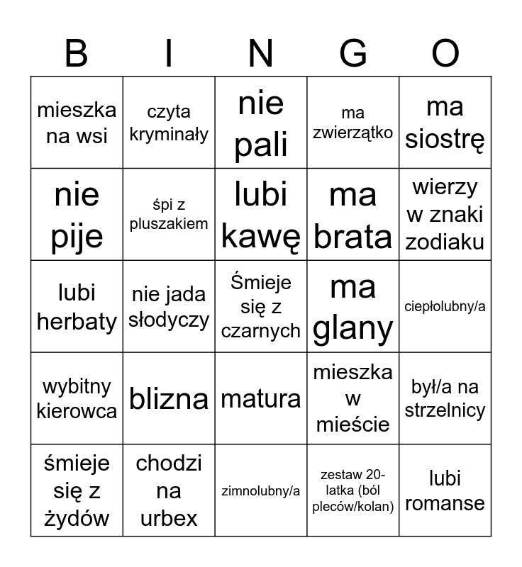 This bingo card has a free space and 24 words: blizna, chodzi na urbex, lubi kawę, śmieje się z żydów, ma siostrę, mieszka na wsi, nie pije, czyta kryminały, ma glany, matura, ma brata, lubi herbaty, mieszka w mieście, był/a na strzelnicy, śpi z pluszakiem, zestaw 20-latka (ból pleców/kolan), ciepłolubny/a, nie pali, wierzy w znaki zodiaku, nie jada słodyczy, lubi romanse, wybitny kierowca, ma zwierzątko and zimnolubny/a.
