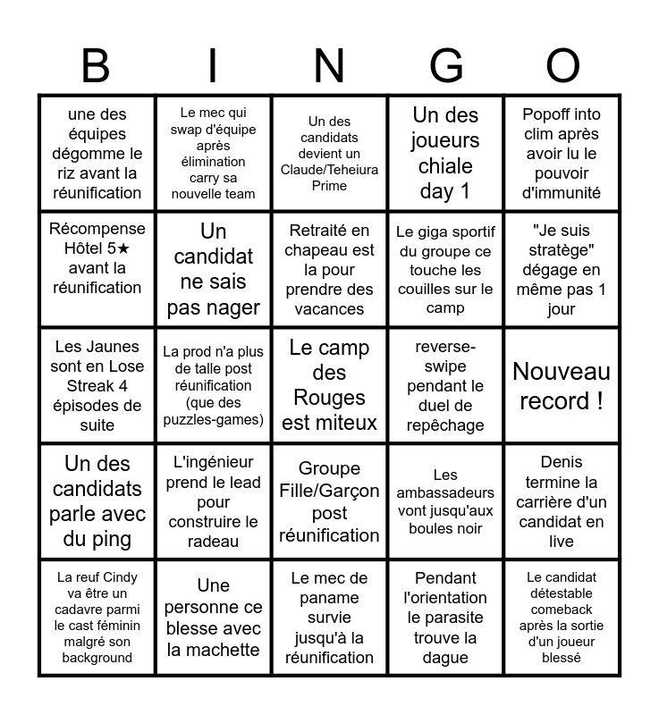 This bingo card has a free space and 24 words: L'ingénieur prend le lead pour construire le radeau, Une personne ce blesse avec la machette, Retraité en chapeau est la pour prendre des vacances, La reuf Cindy va être un cadavre parmi le cast féminin malgré son background, Popoff into clim après avoir lu le pouvoir d'immunité, une des équipes dégomme le riz avant la réunification, Récompense Hôtel 5★ avant la réunification, Le mec qui swap d'équipe après élimination carry sa nouvelle team, reverse-swipe pendant le duel de repêchage, Groupe Fille/Garçon post réunification, Le giga sportif du groupe ce touche les couilles sur le camp, Les Jaunes sont en Lose Streak 4 épisodes de suite, Les ambassadeurs vont jusqu'aux boules noir, Denis termine la carrière d'un candidat en live, Un candidat ne sais pas nager, Pendant l'orientation le parasite trouve la dague, Nouveau record !, Un des candidats devient un Claude/Teheiura Prime, "Je suis stratège" dégage en même pas 1 jour, La prod n'a plus de talle post réunification (que des puzzles-games), Le candidat détestable comeback après la sortie d'un joueur blessé, Un des candidats parle avec du ping, Un des joueurs chiale day 1 and Le mec de paname survie jusqu'à la réunification.