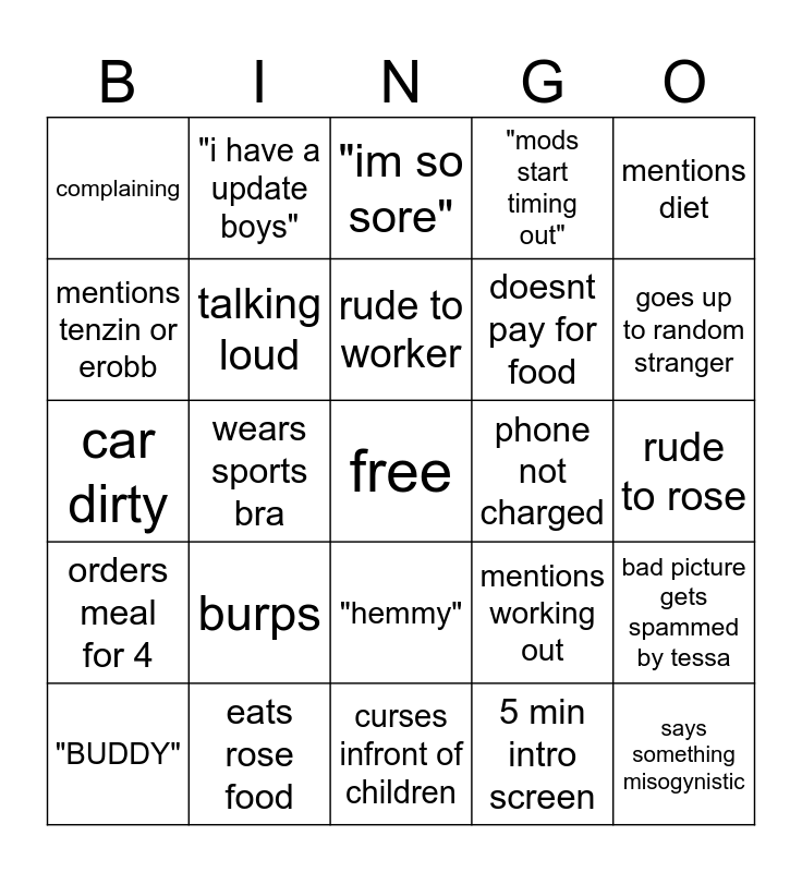 This bingo card has a free space and 24 words: "BUDDY", burps, rude to worker, 5 min intro screen, mentions diet, complaining, "i have a update boys", "im so sore", phone not charged, rude to rose, car dirty, talking loud, mentions working out, bad picture gets spammed by tessa, mentions tenzin or erobb, eats rose food, curses infront of children, "mods start timing out", goes up to random stranger, orders meal for 4, wears sports bra, "hemmy", doesnt pay for food and says something misogynistic.