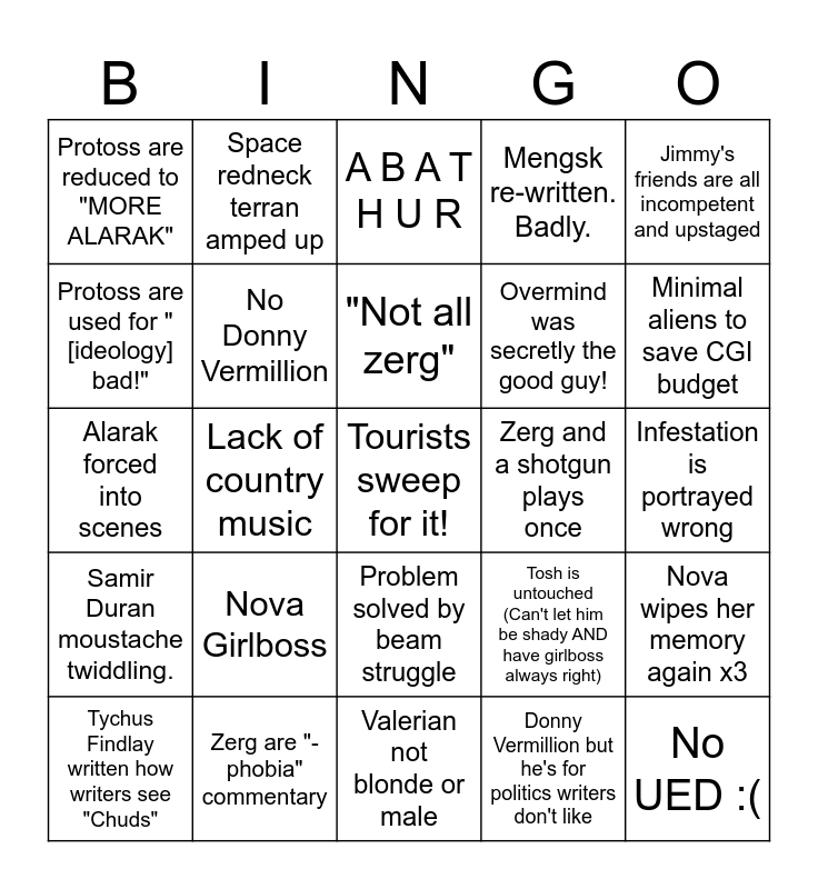 This bingo card has a free space and 24 words: Nova Girlboss, Zerg are "-phobia" commentary, "Not all zerg", Tychus Findlay written how writers see "Chuds", Jimmy's friends are all incompetent and upstaged, Protoss are reduced to "MORE ALARAK", Protoss are used for "[ideology] bad!", Space redneck terran amped up, Zerg and a shotgun plays once, Problem solved by beam struggle, Overmind was secretly the good guy!, Alarak forced into scenes, Tosh is untouched (Can't let him be shady AND have girlboss always right), Nova wipes her memory again x3, No Donny Vermillion, Donny Vermillion but he's for politics writers don't like, Infestation is portrayed wrong, A B A T H U R, Minimal aliens to save CGI budget, Lack of country music, No UED :(, Samir Duran moustache twiddling., Mengsk re-written. Badly. and Valerian not blonde or male.