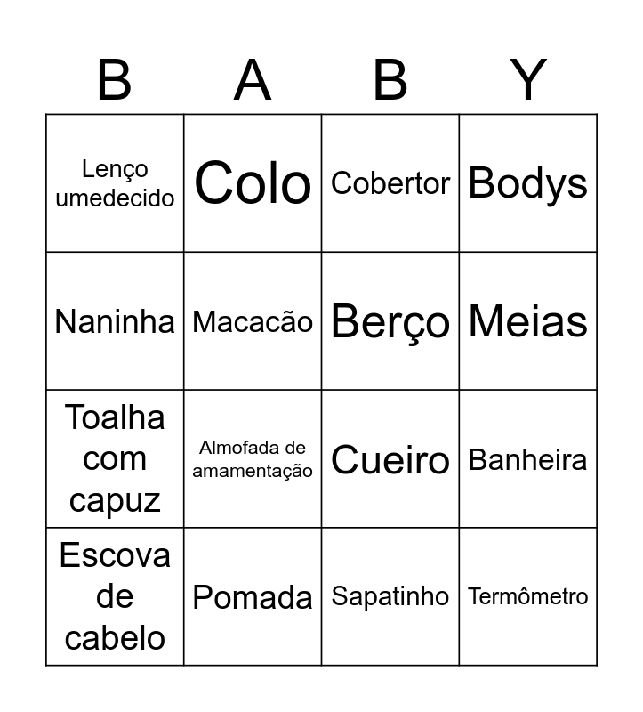This bingo card has 35 words: Fralda, Mamadeira, Chupeta, Berço, Carrinho, Bodys, Macacão, Babador, Meias, Manta, Cueiro, Naninha, Cômoda, Trocador, Lenço umedecido, Pomada, Talco, Banheira, Termômetro, Escova de cabelo, Cadeirinha, Babá eletrônica, Mordedor, Leite, Cobertor, Almofada de amamentação, Brinquedo, Chocalho, Toalha com capuz, Sapatinho, Ultrassom, Barriguinha, Amor, Colo and Soninho.
