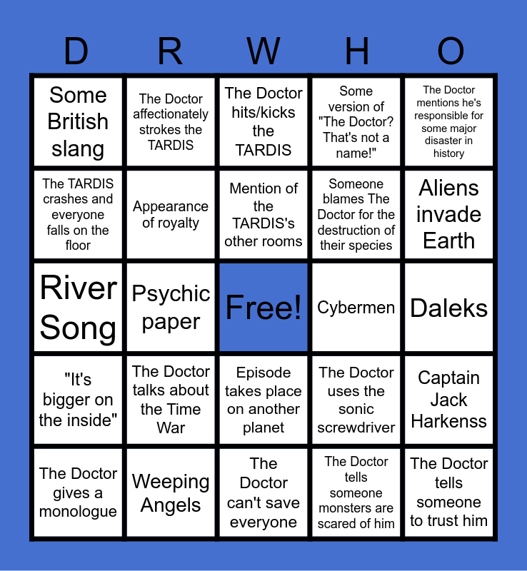 This bingo card has a free space and 34 words: The Doctor states his age, The Doctor tells someone monsters are scared of him, Episode takes place in the future, Robots, "It's bigger on the inside", Appearance of royalty, The Doctor mentions he's responsible for some major disaster in history, The Doctor gives a monologue, The Doctor affectionately strokes the TARDIS, Someone gets slapped, Mention of the TARDIS's other rooms, The Doctor hits/kicks the TARDIS, The Doctor says something is "cool", The Doctor tells someone to "wait here" and they don't listen, Cybermen, Aliens invade Earth, Weeping Angels, River Song, The Doctor talks about the Time War, The Doctor uses the sonic screwdriver, Episode takes place on another planet, Someone makes the Doctor angry, Some British slang, Daleks, The Doctor can't save everyone, The Doctor tells someone to trust him, Some version of "The Doctor? That's not a name!", The Doctor mentions having had a relationship with someone from history, Someone blames The Doctor for the destruction of their species, The TARDIS crashes and everyone falls on the floor, Reference to British government, Psychic paper, Captain Jack Harkenss and The Doctor gets overly excited.