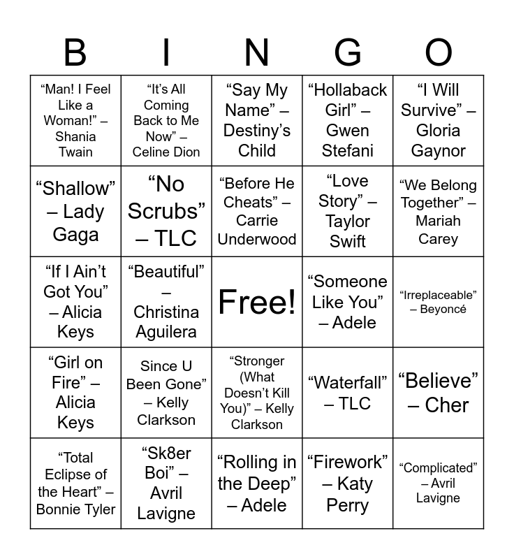 This bingo card has a free space and 25 words: Since U Been Gone” – Kelly Clarkson, “Rolling in the Deep” – Adele, “Before He Cheats” – Carrie Underwood, “Total Eclipse of the Heart” – Bonnie Tyler, “I Will Survive” – Gloria Gaynor, “Man! I Feel Like a Woman!” – Shania Twain, “Shallow” – Lady Gaga, “It’s All Coming Back to Me Now” – Celine Dion, “Someone Like You” – Adele, “Stronger (What Doesn’t Kill You)” – Kelly Clarkson, “Love Story” – Taylor Swift, “If I Ain’t Got You” – Alicia Keys, “Waterfall” – TLC, “Believe” – Cher, “No Scrubs” – TLC, “Unwritten” – Natasha Bedingfield, “Irreplaceable” – Beyoncé, “Say My Name” – Destiny’s Child, “We Belong Together” – Mariah Carey, “Beautiful” – Christina Aguilera, “Complicated” – Avril Lavigne, “Sk8er Boi” – Avril Lavigne, “Girl on Fire” – Alicia Keys, “Hollaback Girl” – Gwen Stefani and “Firework” – Katy Perry.